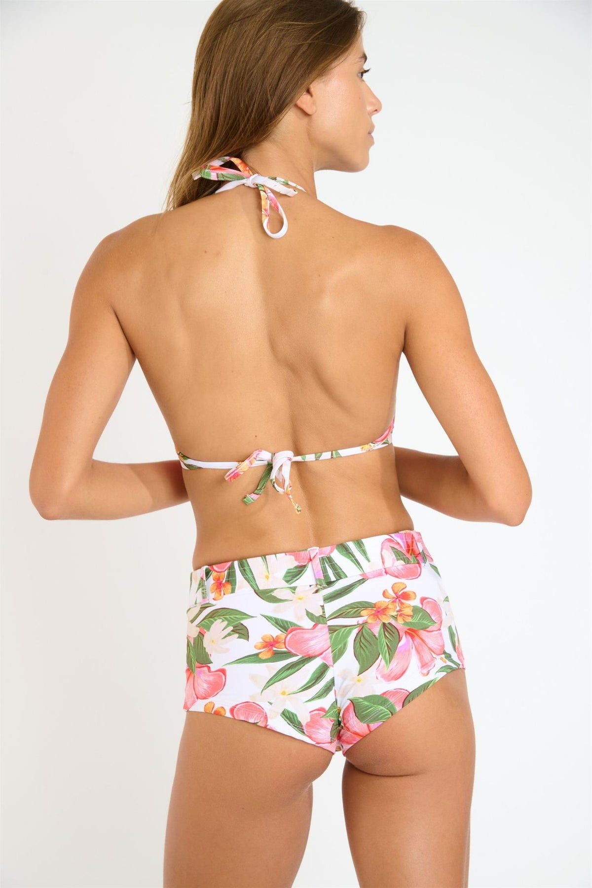 Toppen har en lett omsluttende passform som fremhever bysten på en naturlig måte. Uttakbare innlegg gir fleksibel støtte og form, mens knyting i nakke og rygg gjør det enkelt å tilpasse passformen. En dekorativ ring i front fremhever utringningen og gir designet et elegant og moderne preg.