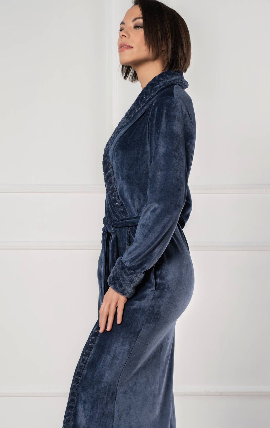 Det glatte velourstoffet i bambus og bomull gir en lett, pustende og temperaturregulerende komfort, mens de myke detaljene på kragen og ermene tilfører varme og visuell dybde. Den klassiske sjalkraven, de oppbrettede ermene og det myke knytebeltet i livet gir en flatterende fasong som føles like elegant som den ser ut.