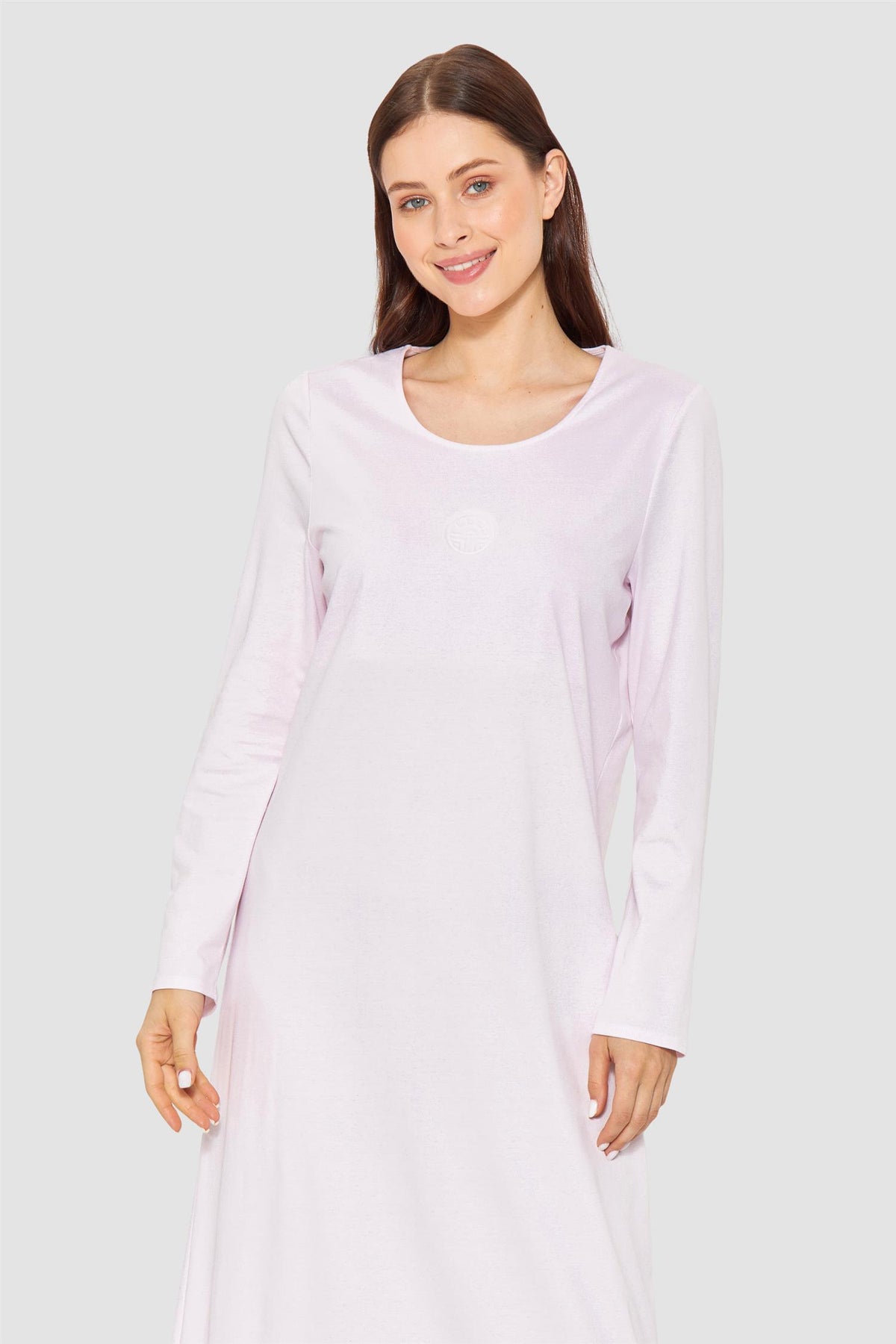 Et preget logo-motiv midt foran tilfører et subtilt, elegant særpreg, mens den ankellange silhuetten gjør nattkjolen perfekt for deg som ønsker både komfort og tidløs stil – enten til søvn eller rolige morgener hjemme.