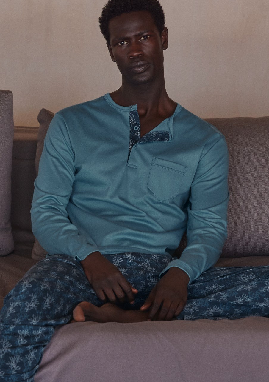 Pysjamas med rett ermer og ben. Knappestolpe og lomme på brystet.