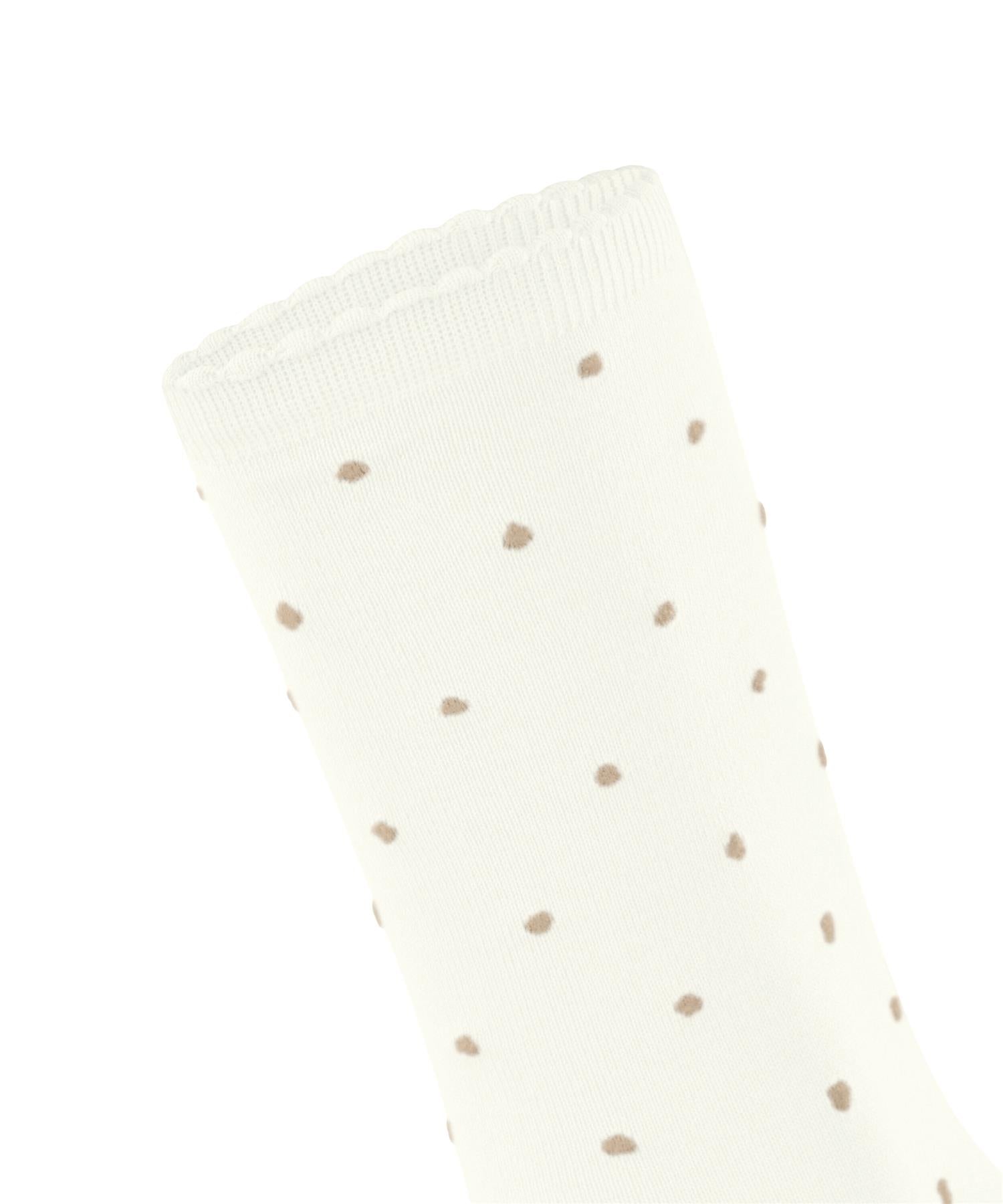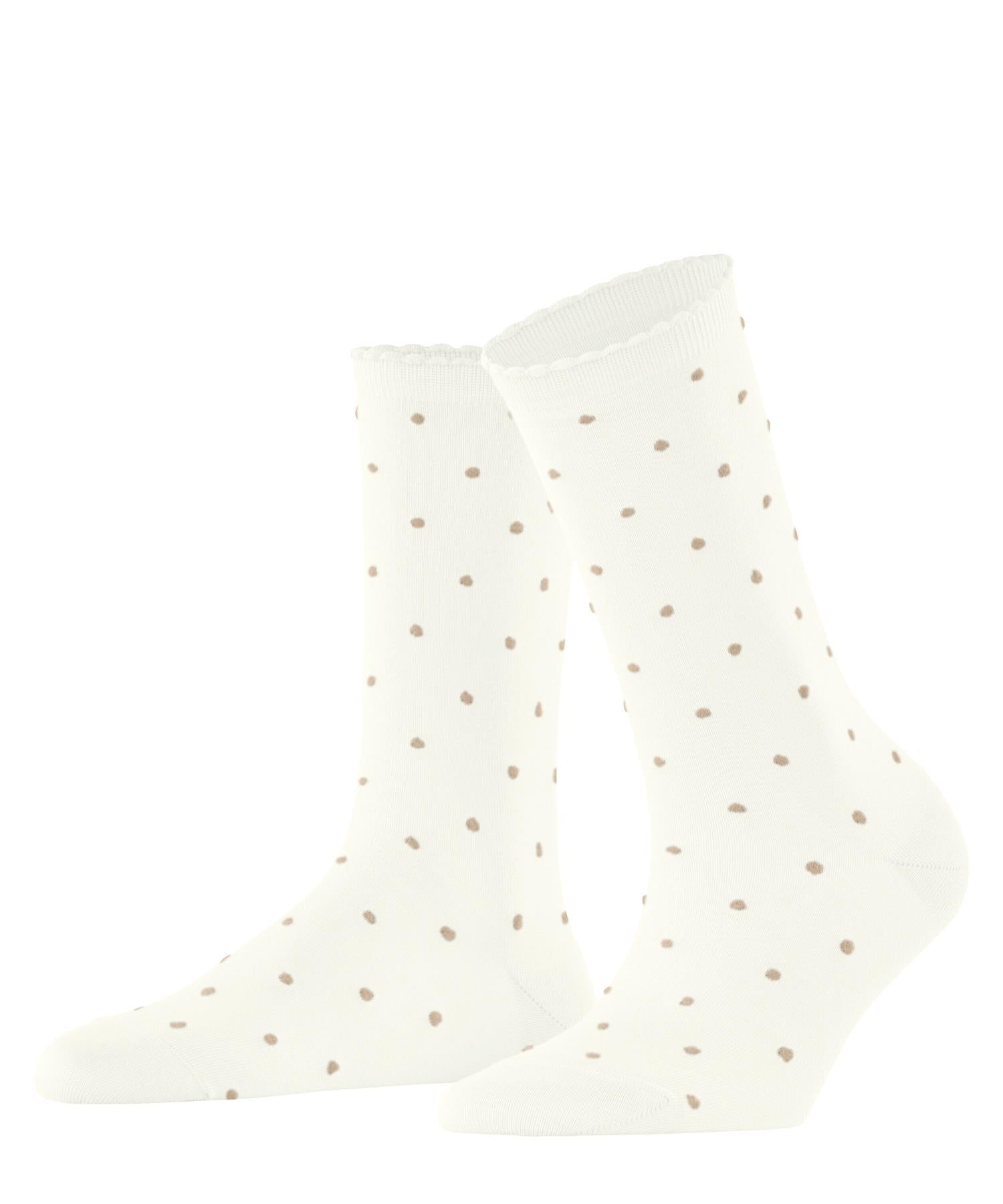 Det fine prikkemønsteret står i delikat kontrast mot den glatte, strikkede bakgrunnen og gir et sofistikert, men moderne uttrykk. Den lett volangkantede avslutningen understreker det feminine preget og gjør sokkene til et lite stylingstatement.