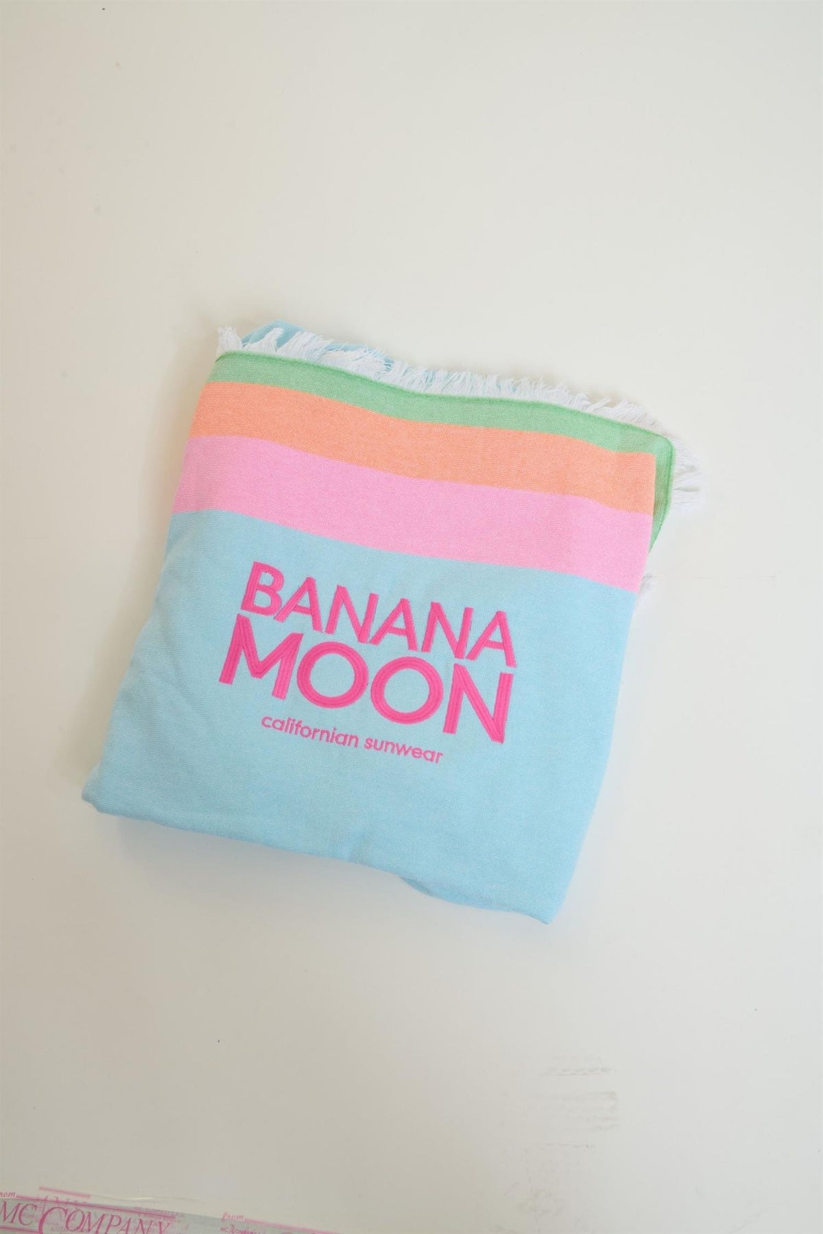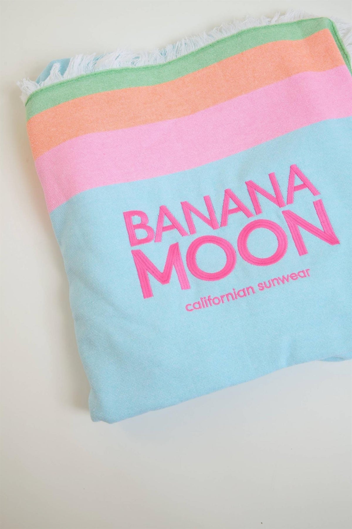 Banana Moon Jaymie Marbella håndkle i turkis er et lett og stilfullt strandhåndkle som passer perfekt til sommerens stranddager. De flerfargede stripene gir et friskt og sommerlig uttrykk, mens frynsekantene tilfører en avslappet strandstil.