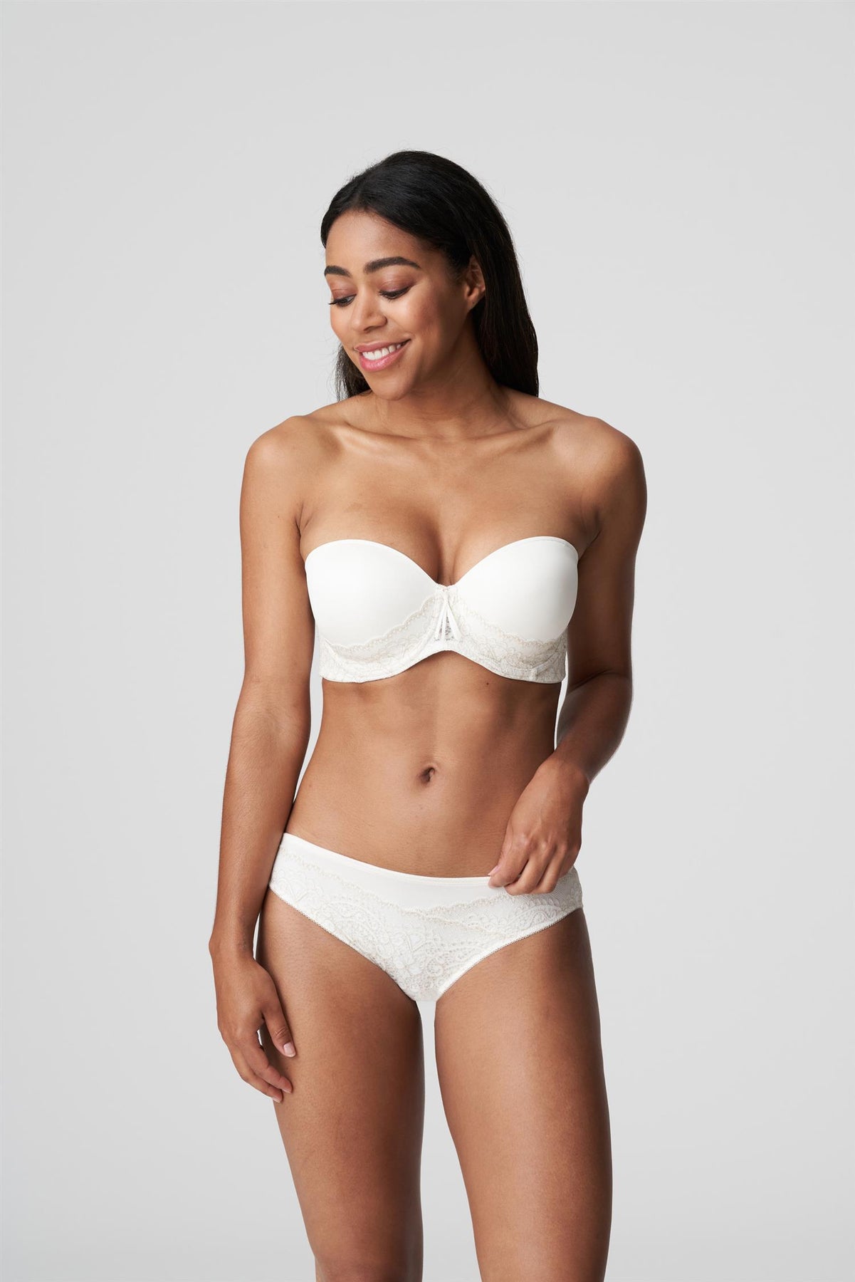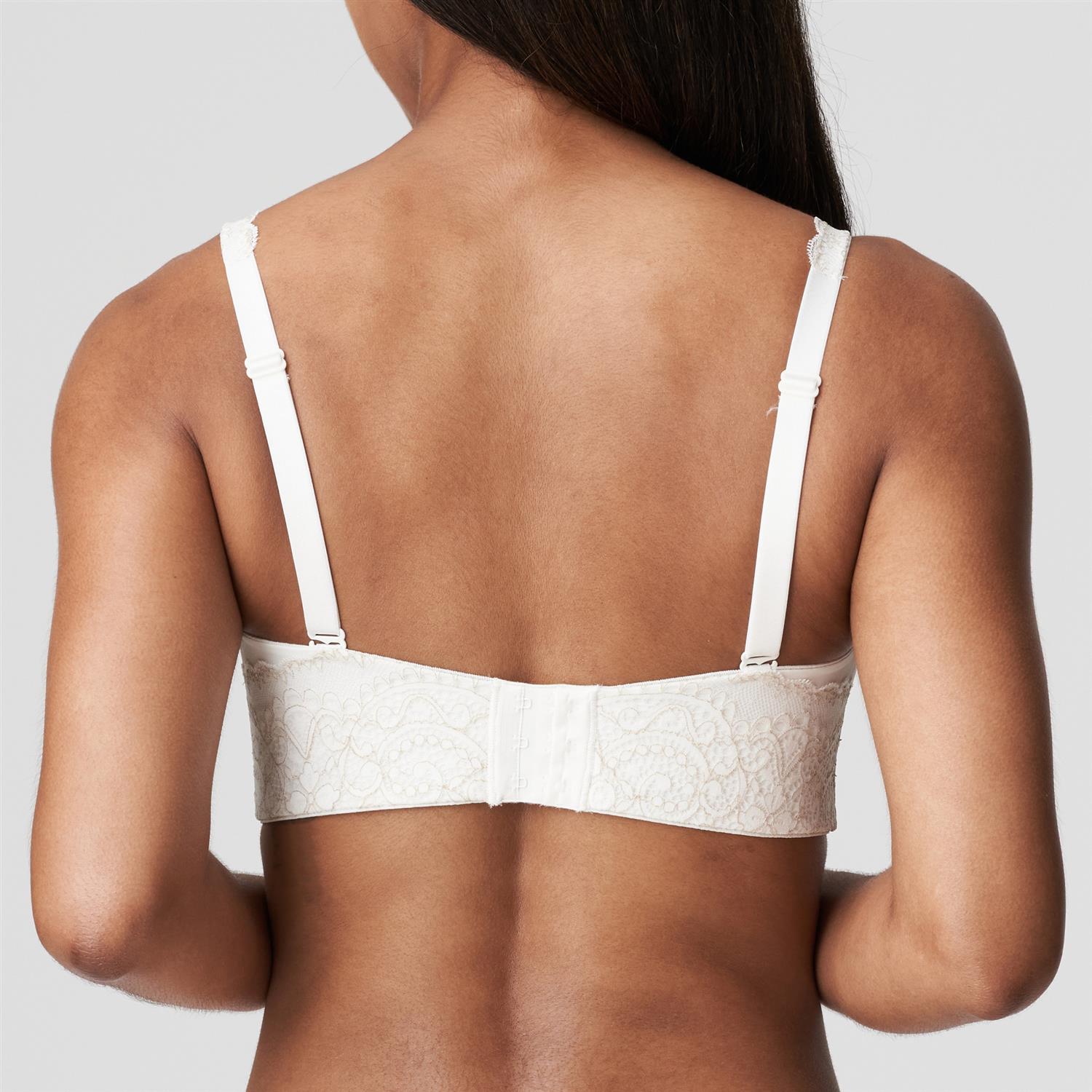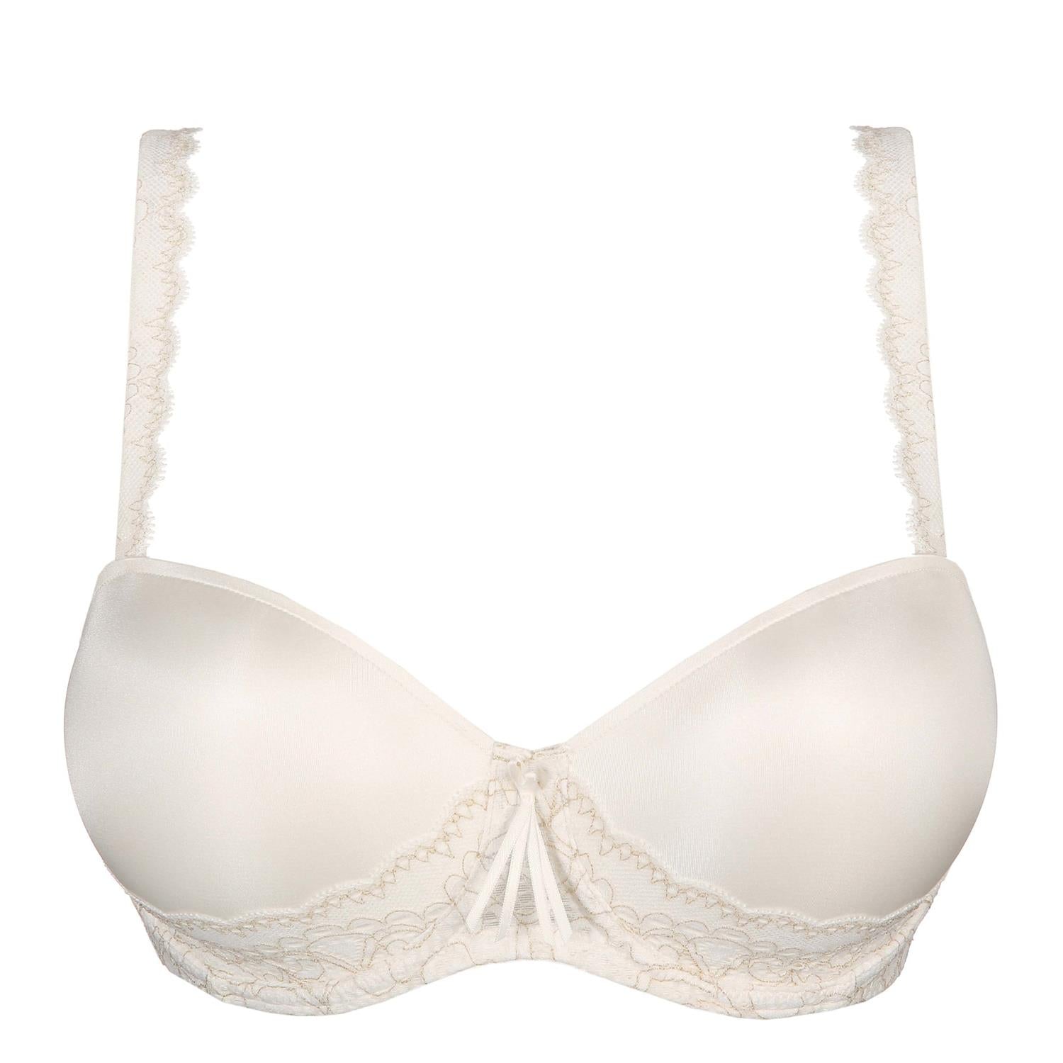 Stroppeløs bandeau bh med vatterte cuper. Delikate stretchblonder med gulltråder i som går på nedsiden av cupen og rundt bak. Nydelig til brud.
