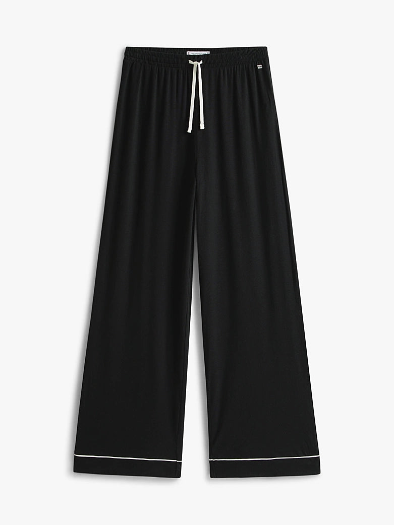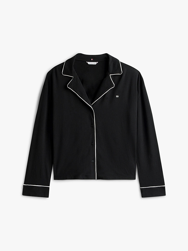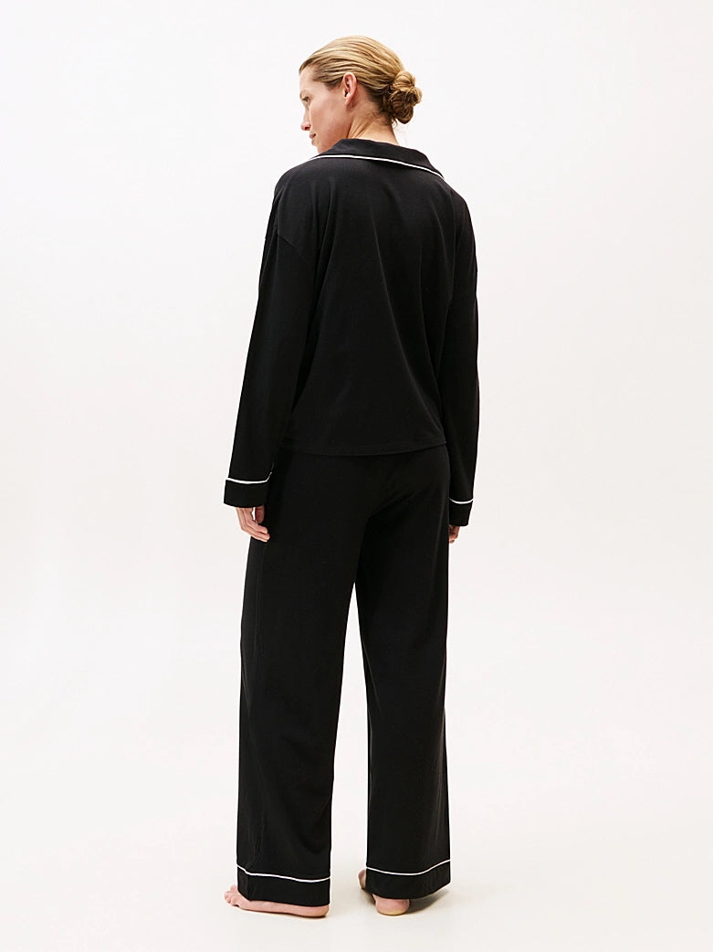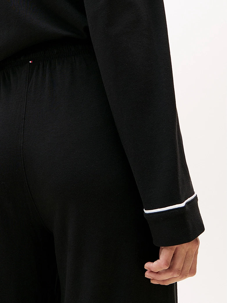 Den langermede skjorten har notch-krage, kontrastpiping og diskret brodert Tommy Hilfiger-flagg på brystet, mens buksene har elastisk linning med snøring og elegante detaljer langs kanten. En perfekt balanse mellom stil og komfort – ideell både til søvn og avslapning.